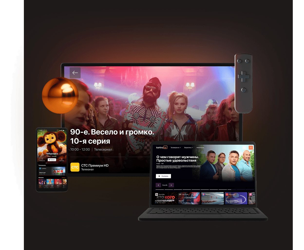 Kartina.TV можно смотреть на Smart TV, планшетах, смартфонах, компьютерах и ноутбуках, приставках Roku и даже на старых телевизорах через фирменную приставку Kartina EVA. В подписку включен доступ на любые три устройства!
